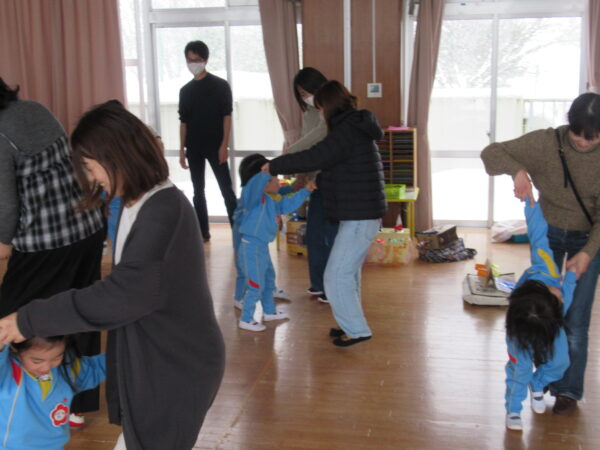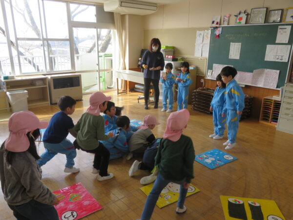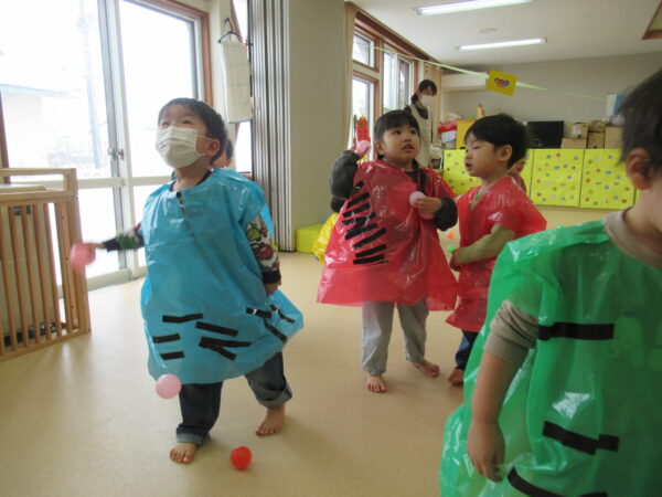 『豆まき』を歌って、子ども達お気に入りの『赤鬼と青鬼のタンゴ』を踊りました。お家の人とも一緒に踊って、大盛り上がりでしたよ🎵