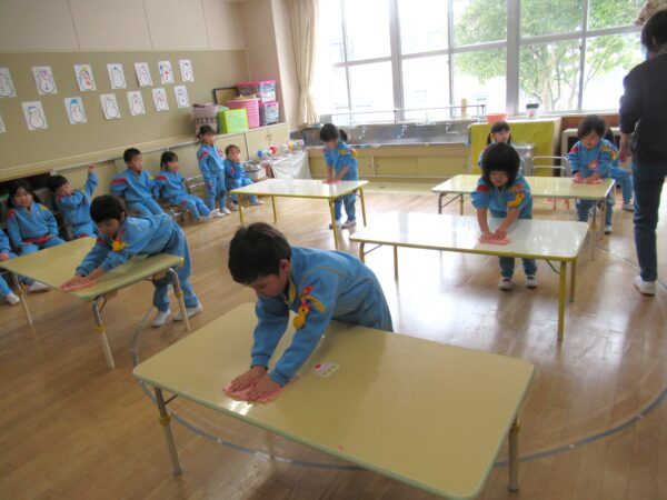 年中さんに見せてもらったお当番のやり方を思い出しながら、テーブルを丁寧に拭いたり、同じグループの友達のために慎重に給食を運んだり、真剣な表情がとてもかっこいいですよ✨