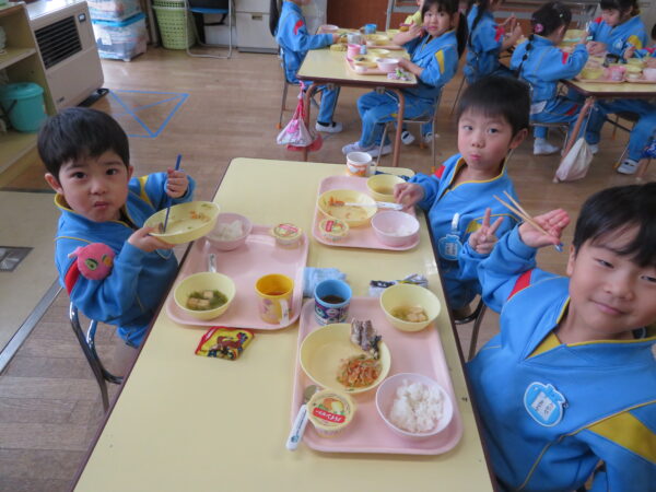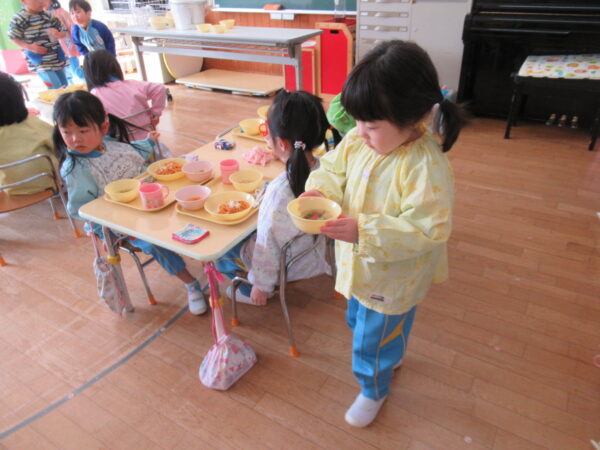 給食を完食する子どもたちが増えてきました。「全部食べた!」とお皿を先生に見せたり、教えてくれたりと、子どもたちの成長を感じます。また、矯正箸から普通の箸へ挑戦する子どもも増えてきました。少し、難しさを感じながらも、一生懸命使う姿が見られました!