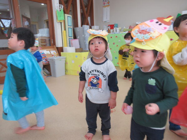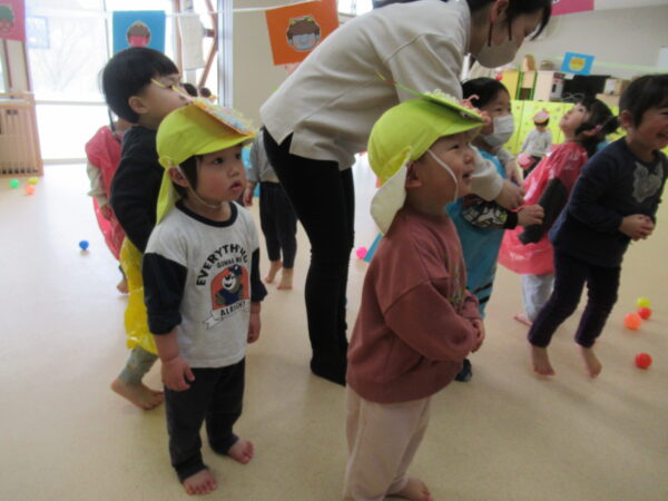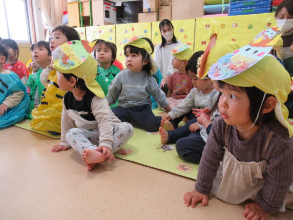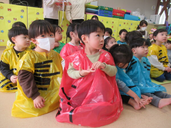 ひよこ組は鬼の帽子、ばなな組は鬼の服を身に着けて節分集会に参加しました!