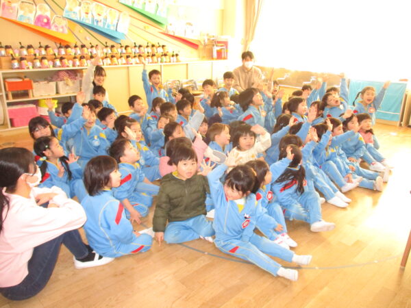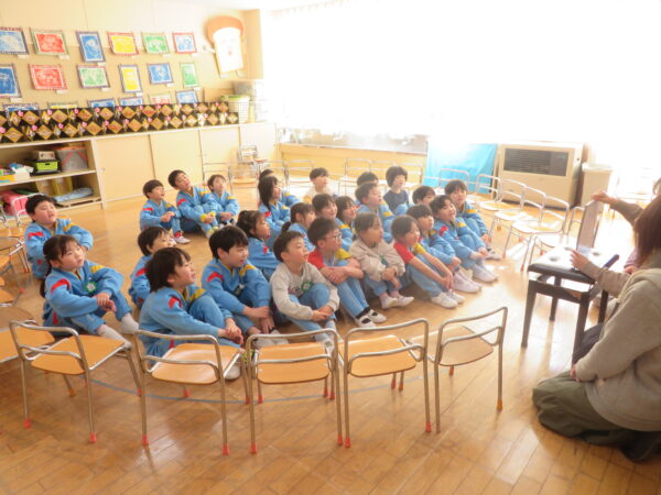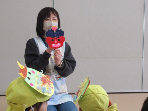 節分集会では、みんなの心の中にいるどんな鬼を退治するのか話を聞いたり、豆まきの歌を歌ったりして楽しみました♪先生の中にいる鬼も紹介してもらいましたよ👀