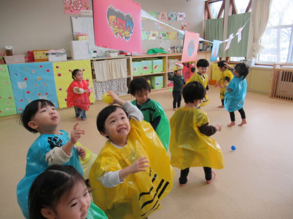 鬼の顔がついた的が登場すると、子どもたちは張り切ってカラーボールを投げて退治していましたよ。