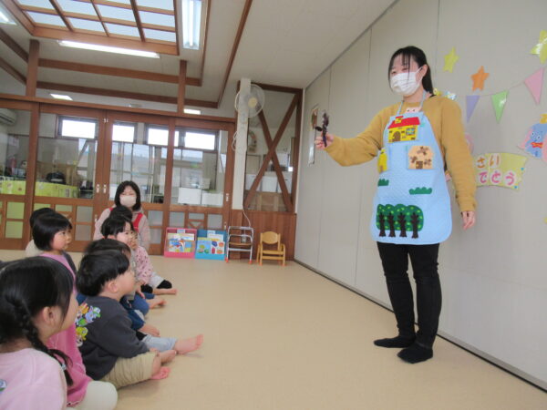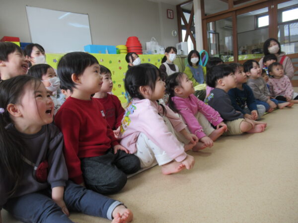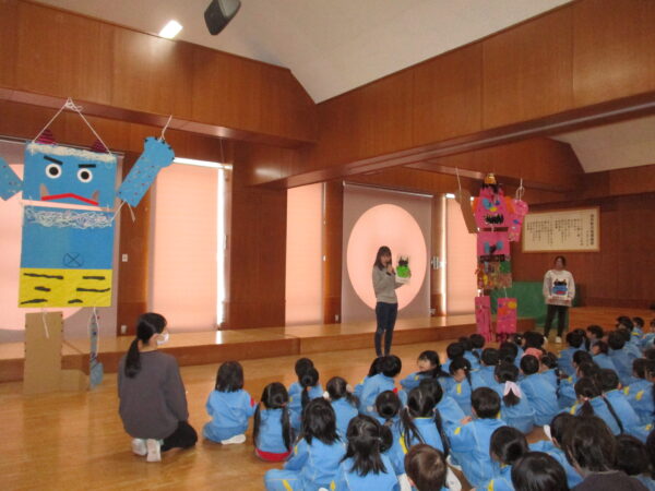 節分の話を真剣な顔でよく聞いた後は、おにたくんが登場するペープサートを見ました。角を探すおにたくん。子どもたちも一緒に探してくれましたよ👀
