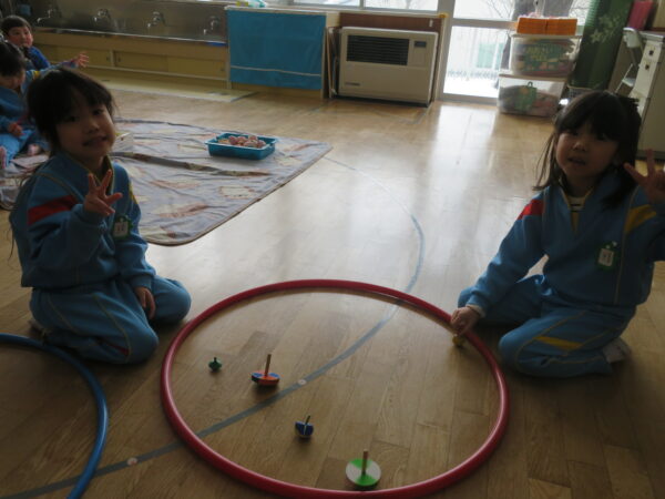 昔の遊びのコーナーはけん玉や福笑い、コマなどで遊びました。