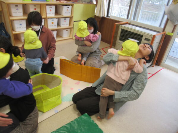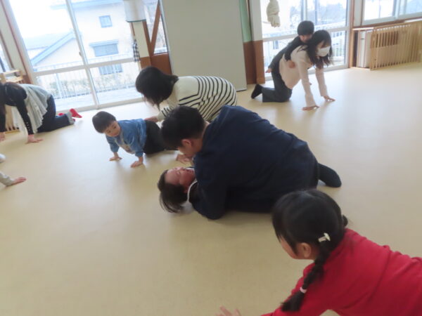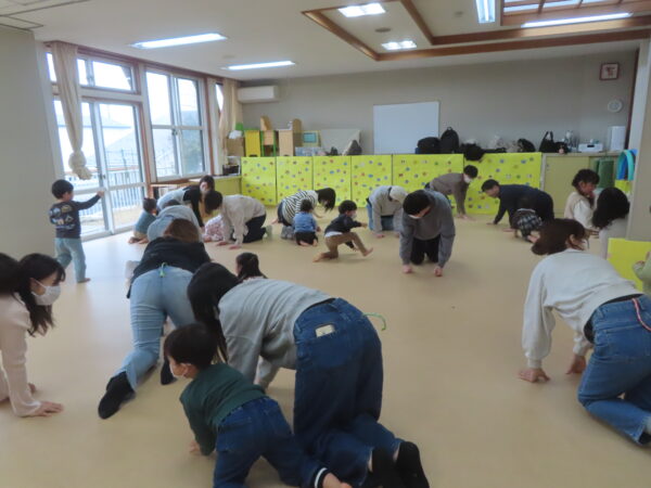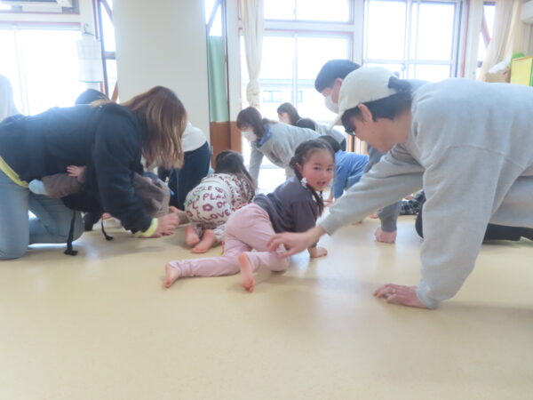 『ハイハイしっぽ取り』ではおうちの人と、一生懸命追いかけたり、逃げたり楽しい声でいっぱいでした!