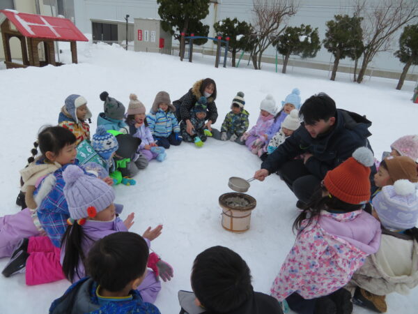 節分行事で、大豆を炒ってきなこ作りにも挑戦しました!七輪で大豆の入った焙烙を振り、ゆっくり炒っていきます。少しずつ、白い豆が色づいたり、香ばしいいい匂いがしたりすることに気が付いていました☆「おいしくなあれ!」と元気におなじないをかけながら、楽しいきなこ作りをしましたよ。