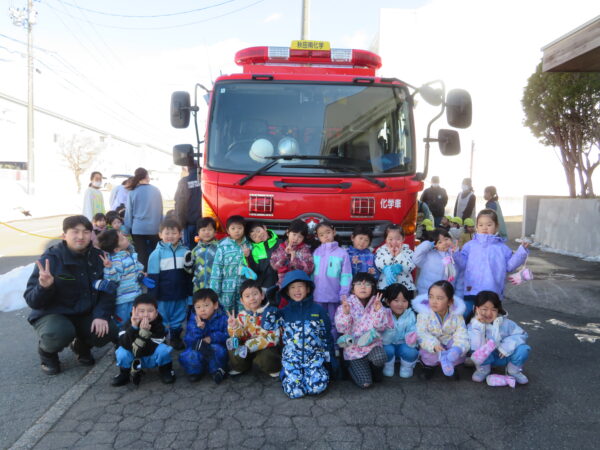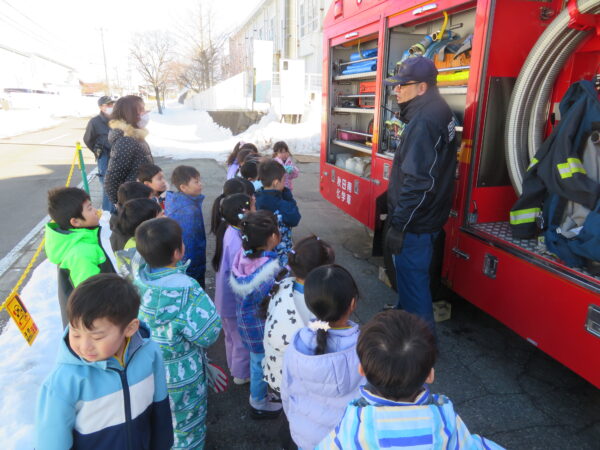 先週末に消防士さんが消防車に乗ってやってきました。消防車を見た子どもたちは興味津々です。その機能についていろいろと質問する姿が見られました。最後には消防車とすずらん組で一緒に写真を撮りました。貴重な体験をさせていただき、ありがとうございました!