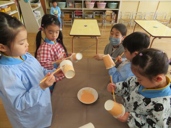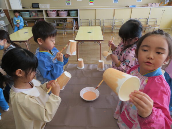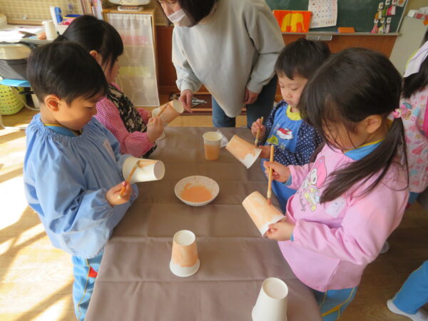 最近のすずらん組は部屋に飾るひな人形の製作を頑張っています。昨日は紙コップに色塗り、今日はお内裏様の着物を作りました。絵の具やハサミ、のりを使いながらじっくり集中して作る姿がとても素敵です。