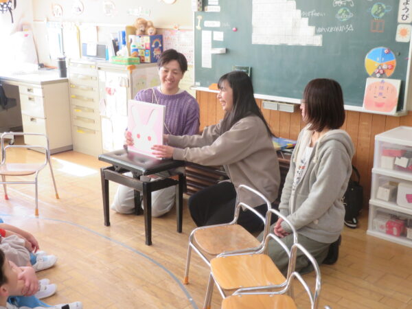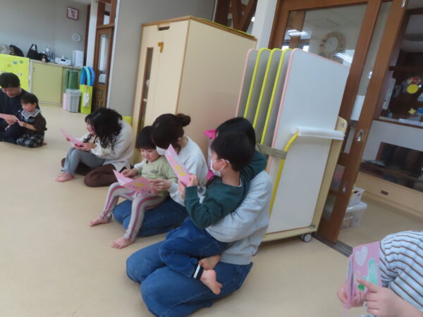 最後はみんなで作ったプレゼントを渡しました。事前になんて言って渡そうかみんなで考えると「だいすき💕って言う!」と張り切って、渡すのをとても楽しみにしていました😊おうちの人にプレゼントを渡せて、とっても嬉しそうでしたね♪