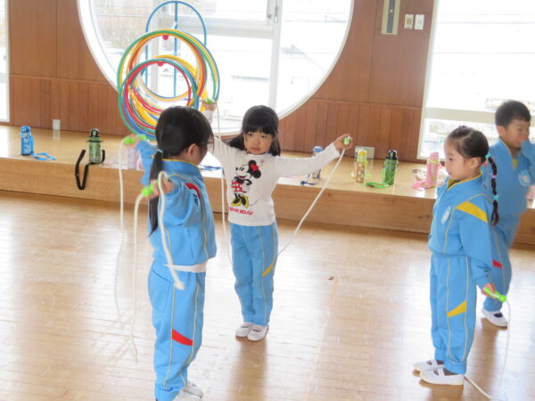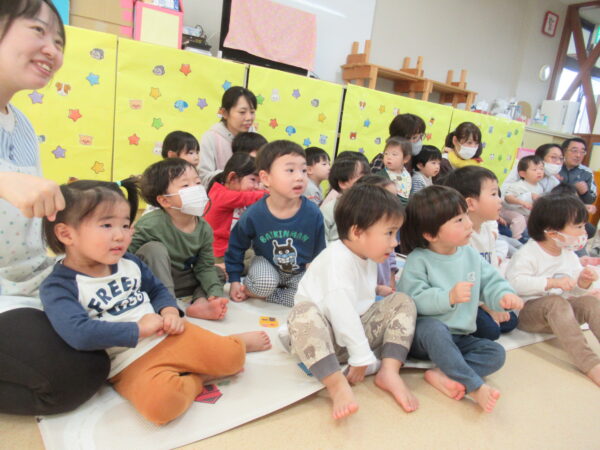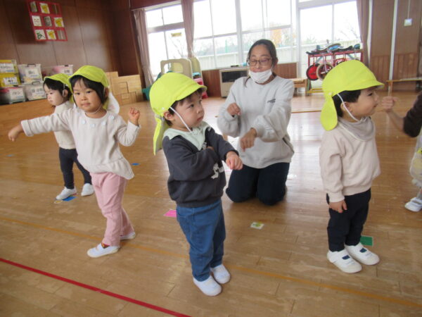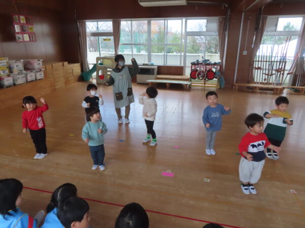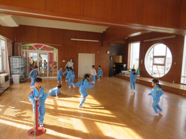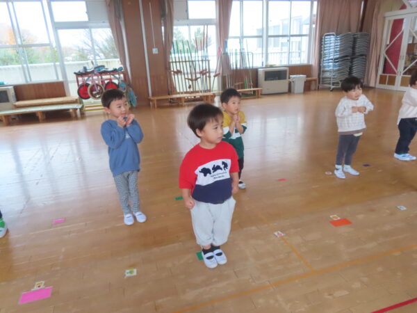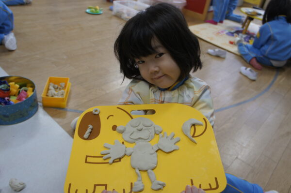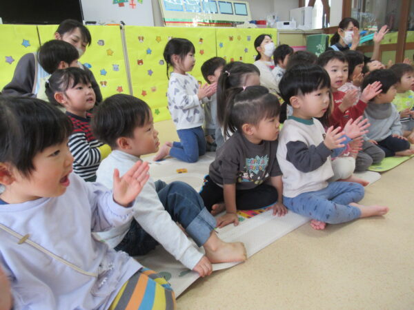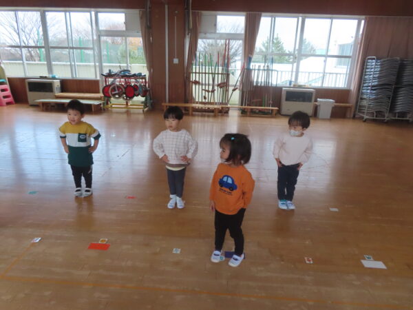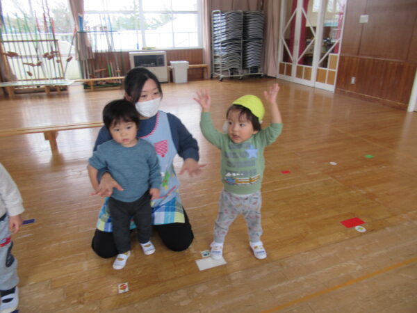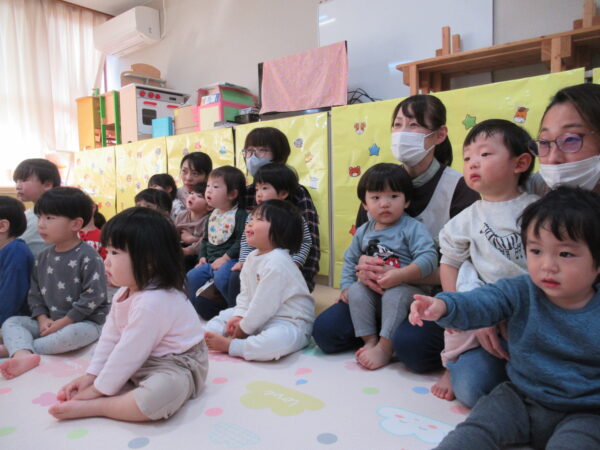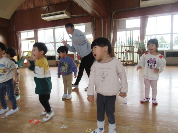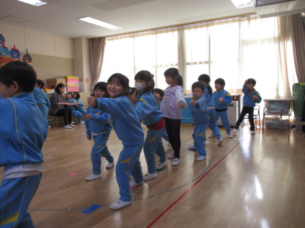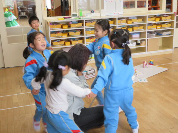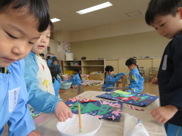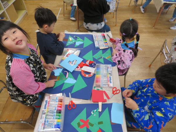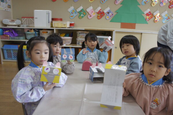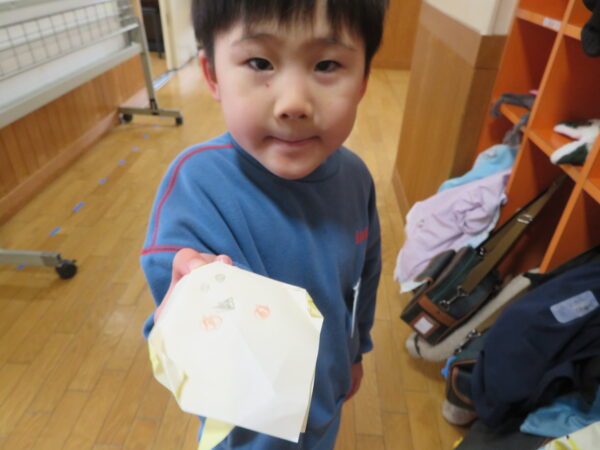 製作遊びでは、冬の壁面製作をみんなで楽しんだ時にシマエナガを折り紙で作りました。そこから、シマエナガ屋さんが始まりました!たくさんのシマエナガ友達にプレゼントしたり、年中、年少さんにプレゼントをしたり、お店屋さんごっこが展開しています。「お金がないから…」と言っていた友達には、「好きなの何羽でもいいよ!」と大盤振る舞いのお店屋さんです😊!