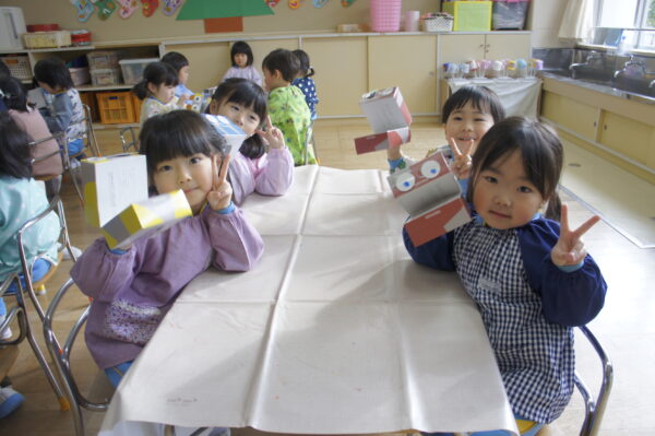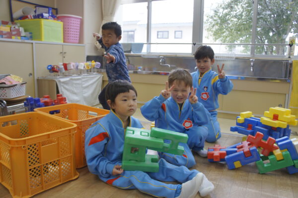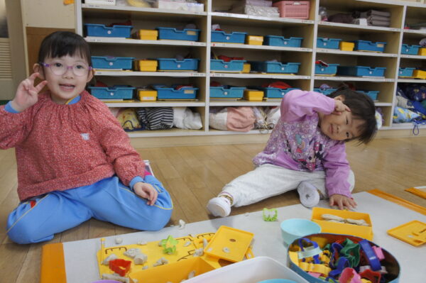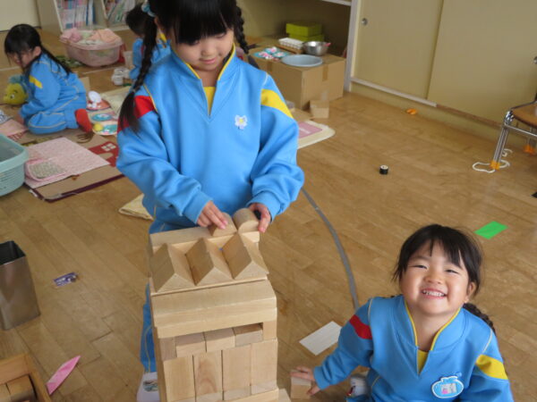 レゴブロックでは、作りたい物のイメージを自分の言葉で友達に伝え、動物園や水族館、バスケットゴール場など、一緒に作ることを楽しんでいます。友達と一緒に作るからこそ、いろいろなアイディアが生まれ、表現する力が身に付くのだろうなあ…と子ども達の姿を見て実感します。