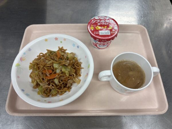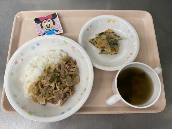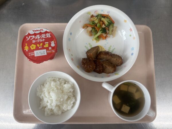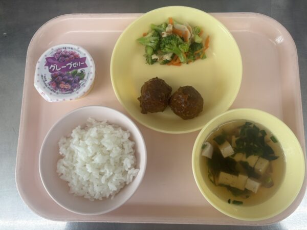 今日の給食は、ごはん・すまし汁(しいたけ、豆腐、ほうれん草)・みそだれ肉団子・和風和え・フルーツゼリー(未満児さんは鉄分ヨーグルト)です。