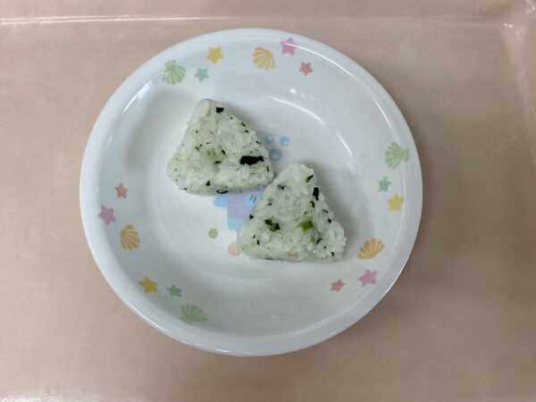未満児さんの午後の手作りおやつは、若菜おにぎりです。
