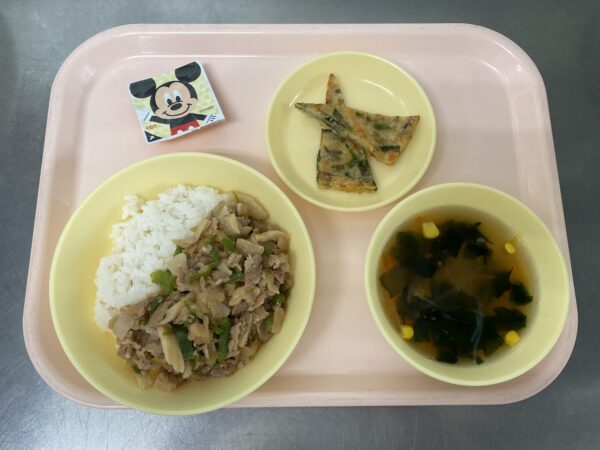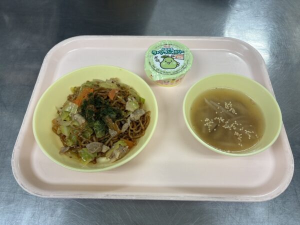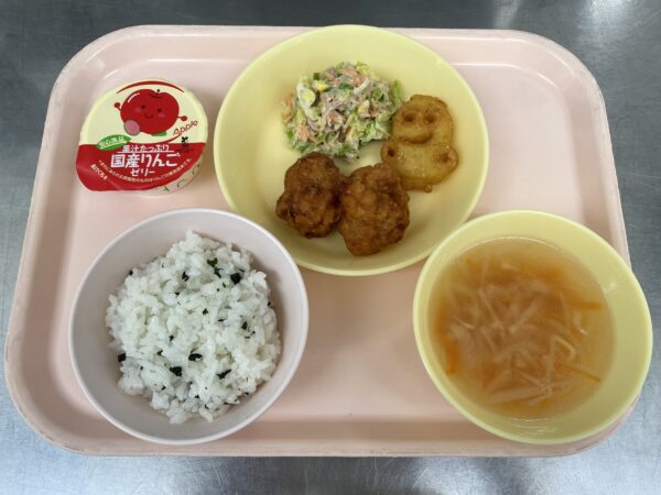 今日の給食は、わかめごはん・ABCスープ(ベーコン、玉ねぎ、人参、ABCマカロニ)・唐揚げ・ミニオンポテト・ツナサラダ・りんごゼリーです。