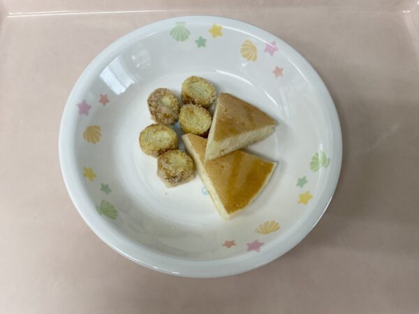 未満児さんの午後の手作りおやつは、お麩ラスク&ホットケーキです。