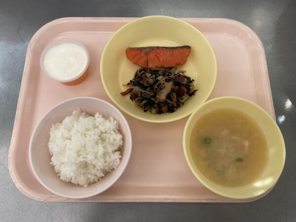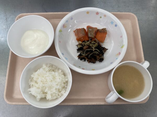 今日の給食は、ごはん・みそ汁(切干大根、油揚げ、インゲン)・鮭の塩焼き・ひじきの煮物・オレンジゼリーヨーグルトのせ(未満児さんはヨーグルト)です。