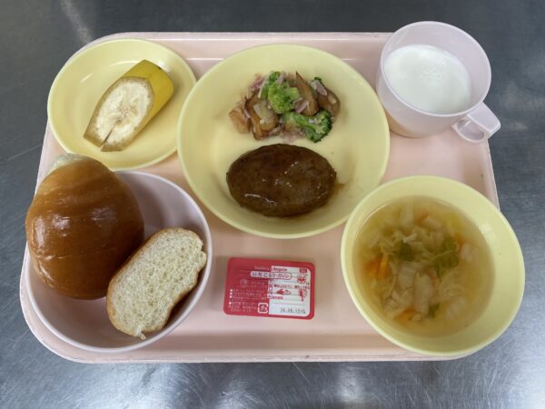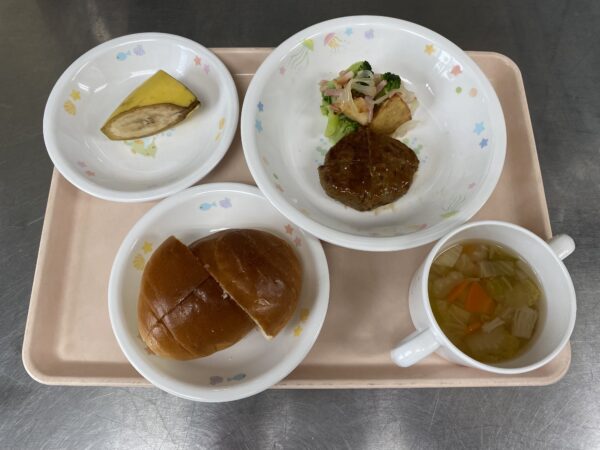 ロールパン(いちごジャム)・白菜スープ(白菜、えのき、人参)・ハンバーグ・ジャーマンポテト・バナナです。