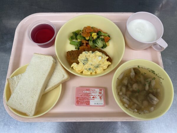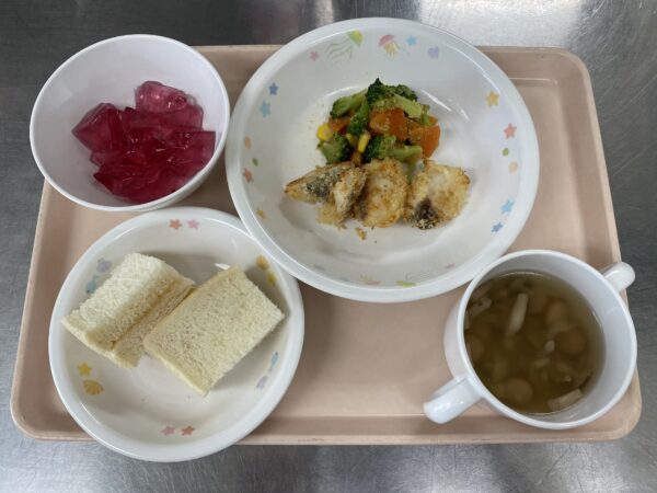 食パン(りんごジャム)・きのこスープ(ウインナー、しめじ、えのき)・タラのパン粉焼き・中華サラダ・ぶどうゼリーです。