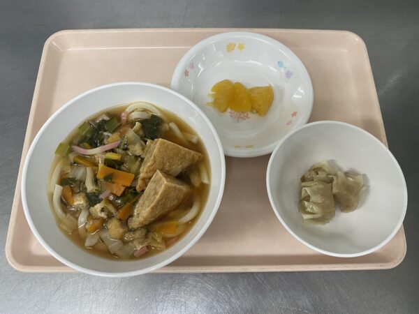 今日の未満児さんの給食は、きつねうどん(信田煮、油揚げ、白菜、人参、小松菜、ねぎ、しめじ、かまぼこ)・肉しゅうまい・甘夏缶です。