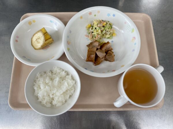 ごはん・ABCスープ(ベーコン、玉ねぎ、人参、ABCマカロニ)・照り焼きチキン・ツナサラダ・バナナです。