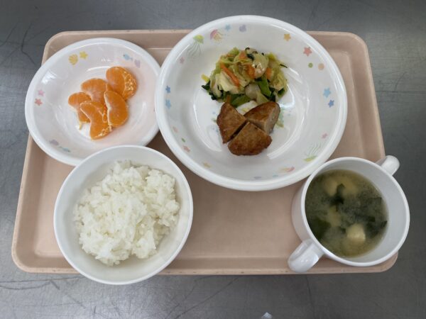 今日の給食は、ごはん・みそ汁(わかめ、豆腐、玉ねぎ)・鶏と野菜の焼きつくね・キャベツとちくわの炒め煮・みかんです。