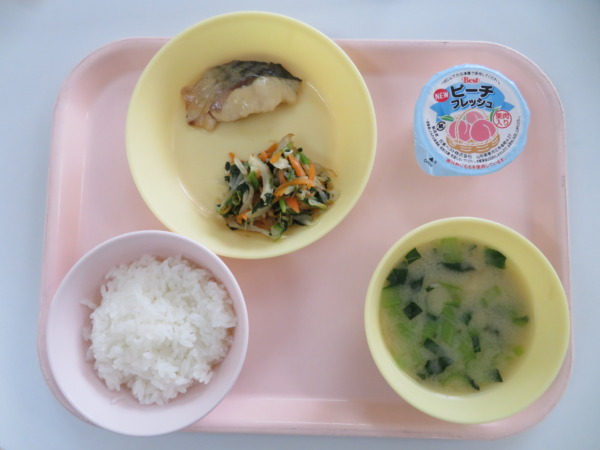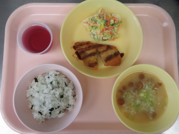 今日の給食は、わかめごはん・なめこの味噌汁・白身魚フライ・コールスローサラダ・ぶどうゼリーでした。