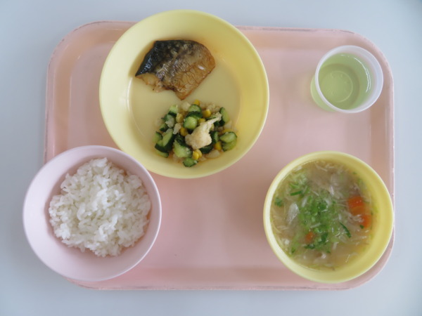 今日の給食は、ごはん・豚汁・さばの塩焼き・ごま和え・青りんごゼリーです。