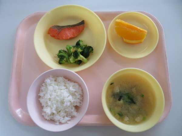 今日の給食は、ごはん・みそ汁・鮭の塩焼き・ブロッコリーおかか和え・オレンジです。