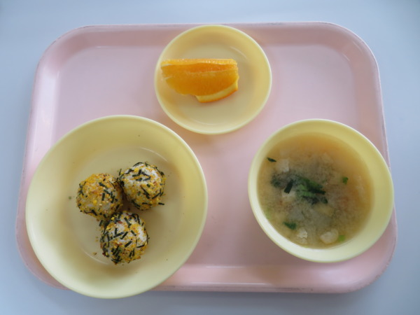 今日の給食は、のりたまおにぎり・みそ汁・オレンジです。