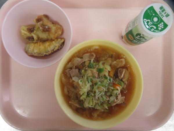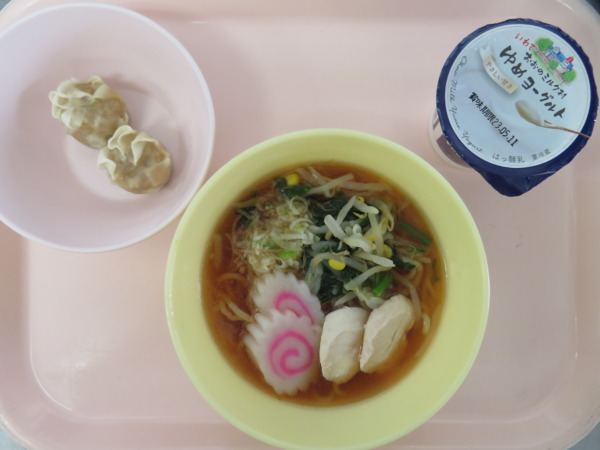 今日の給食は、醤油ラーメン・肉焼売・ヨーグルトです。