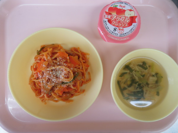 今日の給食は、鮭わかめおにぎり・豚汁・青りんごゼリーです。