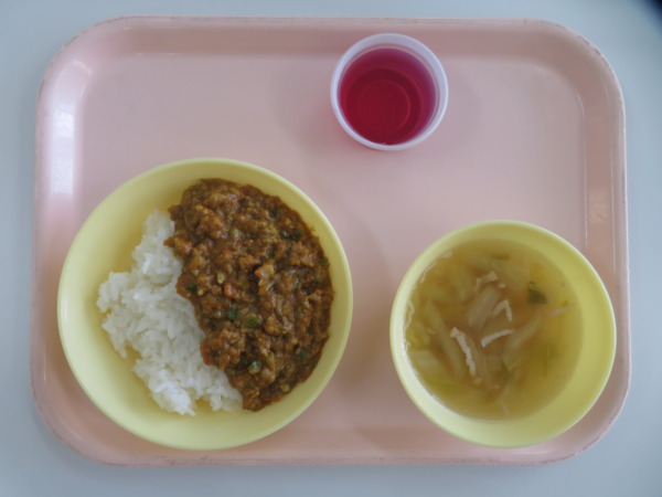 今日の給食はキーマカレー・白菜スープ・ぶどうゼリーです。