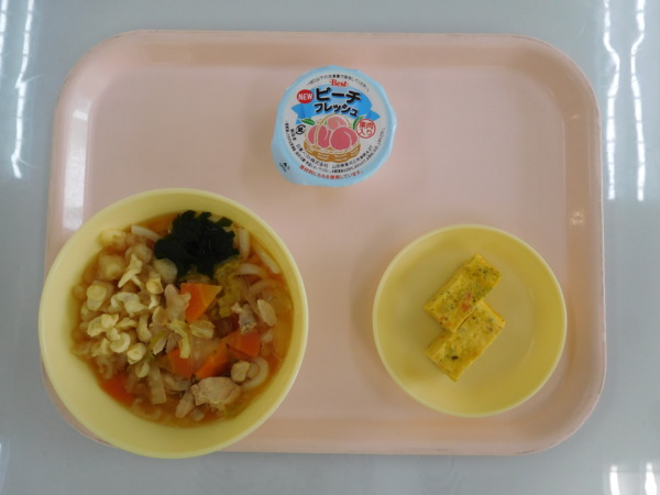 今日の給食は、たぬきうどん・厚焼き玉子・フルーツゼリーです。