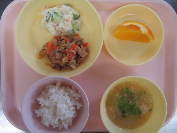 今日の給食は、ごはん・みそ汁・豚の生姜焼き・ポテトチーズサラダ・オレンジです。
