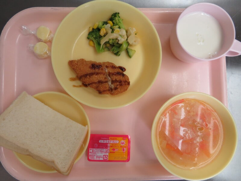 今日の給食は、食パン、ベーコンスープ、ささみカツ、花野菜サラダ、キャンディチーズ、牛乳です。