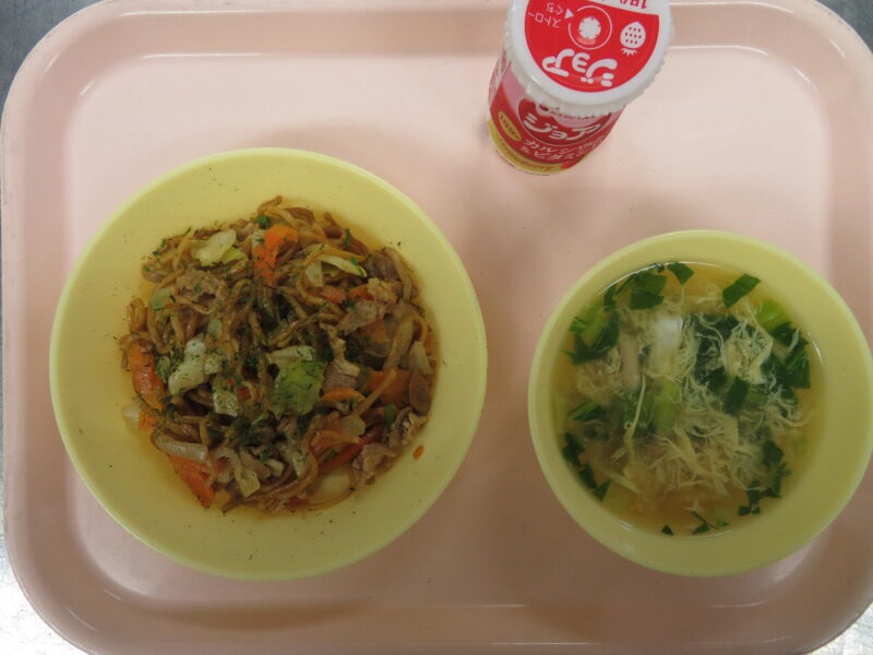 今日の給食は、焼きそば、たまごスープ、ジョア(ストロベリー)です。