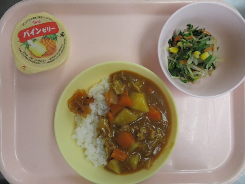 今日の給食は、ポークカレー・ナムル・フルーツゼリーです。