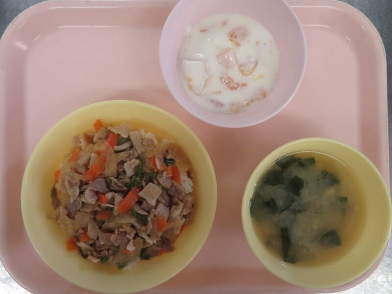 今日の給食は、焼肉丼・みそ汁・フルーツヨーグルトです。