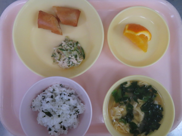 今日の給食は、ごはん、かきたまスープ、春巻き、バンバンジーサラダ、オレンジです。