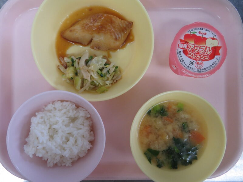 今日の給食は、ごはん・みそ汁・カレイの照り焼き・ちくわサラダ・アップルゼリーです。
