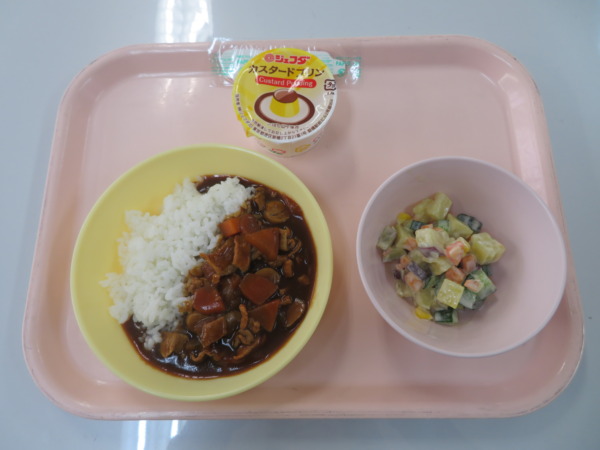 今日の給食は、ハヤシライス、コロコロサラダ、プリンです。
