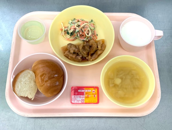今日の給食は、バターロール(いちご&マーガリン)・鶏の照り焼き・ポテトスープ・スパゲティサラダ・青りんごゼリー・牛乳です。