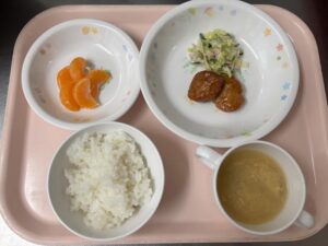 ごはん・かきたま汁・肉団子・コールスローサラダ・みかんです。