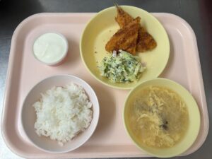 今日の給食は、ごはん・かきたま汁・アジフライ・コールスローサラダ・ももゼリーヨーグルトのせです。