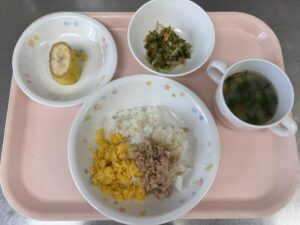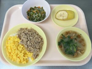 今日の給食は、二色丼・なめこと小松菜、じゃがいものみそ汁・めかぶ和え・バナナです。