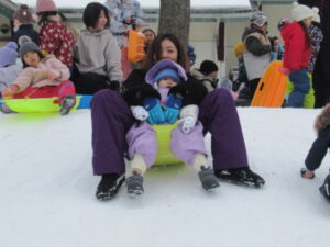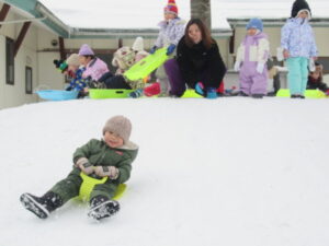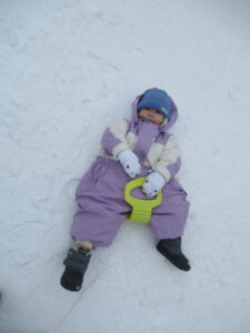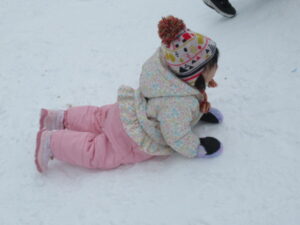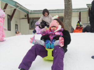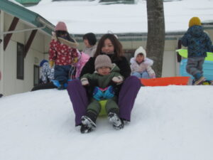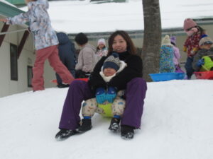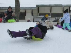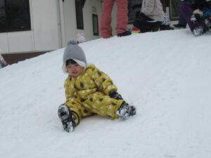 雪に体が馴染んでから、クルクルそりと大きなそりにチャレンジ!!先生と一緒に乗って滑ったり、「ひとりでやる!」としっかりグリップを掴んで滑り降りたり、繰り返し楽しみました。(そり遊びをたくさん楽しんだのですが、安全確保のため一部の撮影しかできずすみません。ご了承ください。)
