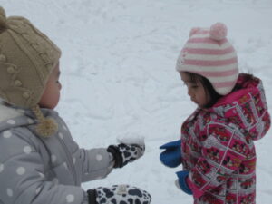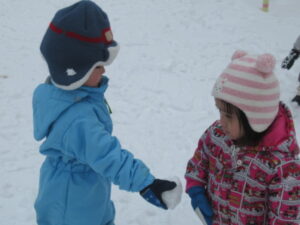 雪をギュッと固めて「はいどうぞ」とアイスクリームをプレゼントしあったり、「おいしいねぇ」と食べる真似をしてお友達とのやり取りを楽しむ姿も見られました。