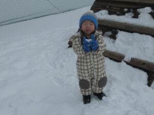 ジャンプスーツに着替え、手袋と帽子、ブーツを身につけ準備万端!真っ白な園庭に飛び出しました。