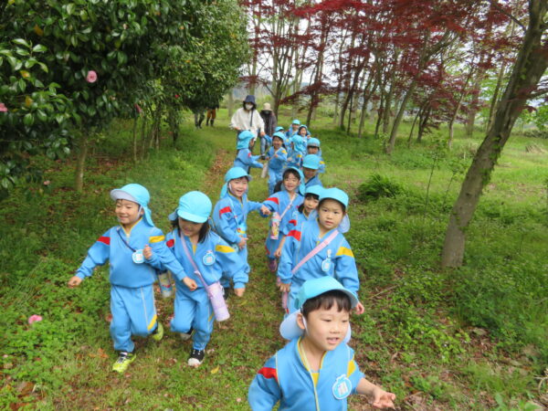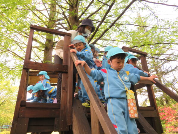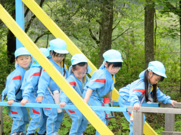 先日、進級してから初めて御山野楽校に出掛けました!おやまの探索ではツリーハウスデッキやさんかくはねばしを恐る恐る渡ったり、見晴らし台から河辺の町並みを眺めたりと楽しそうに過ごしていました!
