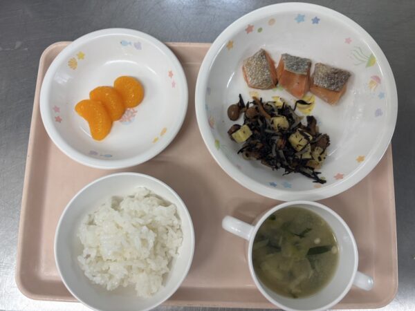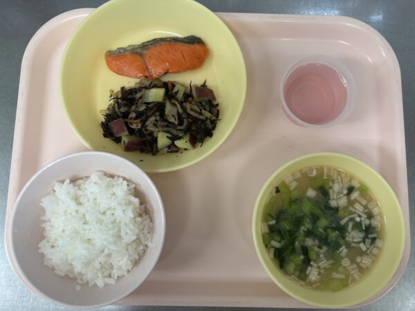 今日の給食は、ごはん・みそ汁(キャベツ、えのき、小松菜)・鮭の塩焼き・ひじきの煮物・ももゼリーです。